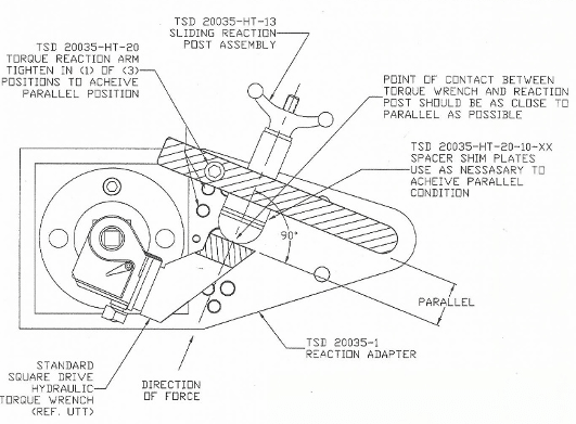 The Shim Set is used on a Hydraulic System to change the reaction position of the point of contact between the Hydraulic Torque Wrench reaction foot and the system reaction post. The shims allow the technician to achieve a “Parallel Condition” where the force generated by the hydraulic torque wrench reacts squarely on the TSD20035-HT-20 Torque Reaction Arm. An alternate version of this shim set is also available for higher capacity systems.