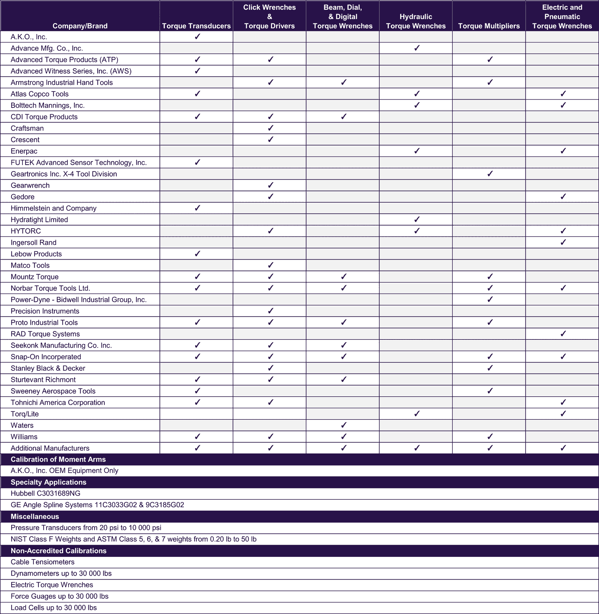 Below, is a general list of the most common brands and torque tools we calibrate. If your tool is not listed, please contact us.